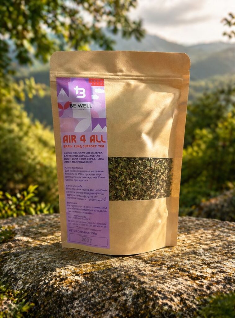 Kvalitet vazduha ne možemo uvek kontrolisati — ali možemo podržati svoj organizam. Be Well Air Tea je formulisan kao prirodna podrška higijeni gornjih disajnih puteva kroz biljke koje doprinose smirivanju sluzokože i olakšavaju disanje. Aktivni principi biljaka imaju antiseptična, umirujuća i blago protivupalna svojstva koja pomažu u svakodnevnoj zaštiti. Može se koristiti kao čaj ili inhalacija, kao deo rutine za lakše i čistije disanje.